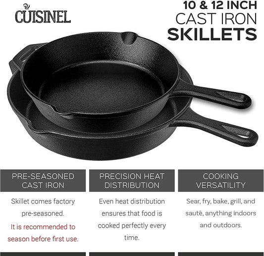 Cast Iron Skillet Set - 10" + 12" Frying Pan + Glass Lids + 2 Handle Cover Grips - Pre-Seasoned Oven Cookware - Indoor/Outdoor Use - Grill, Stovetop, Induction, BBQ, Camping, Fire Use